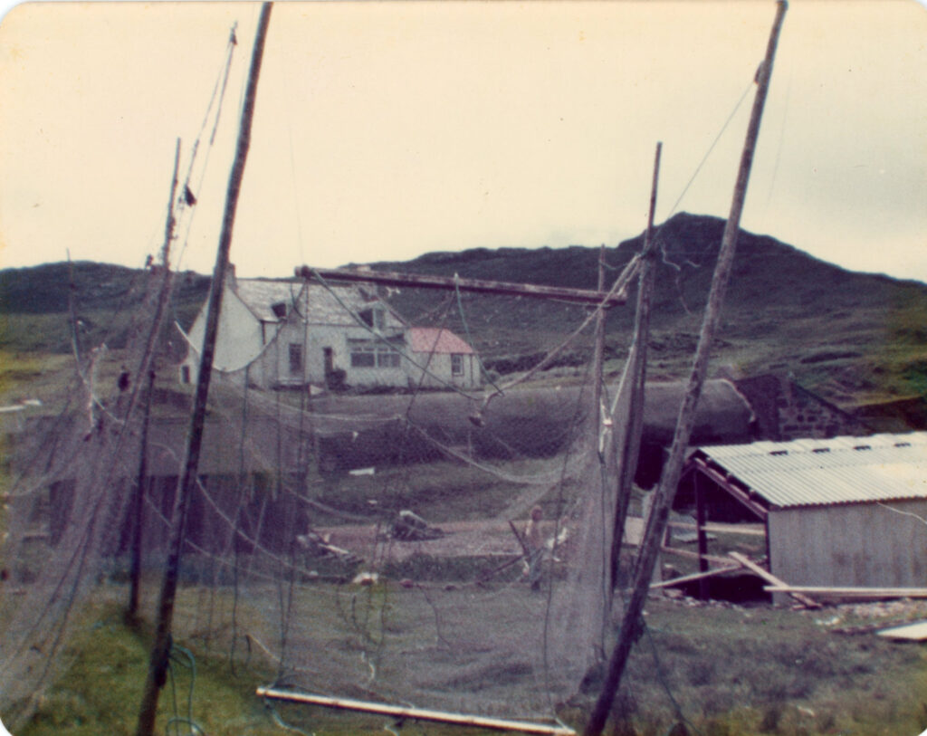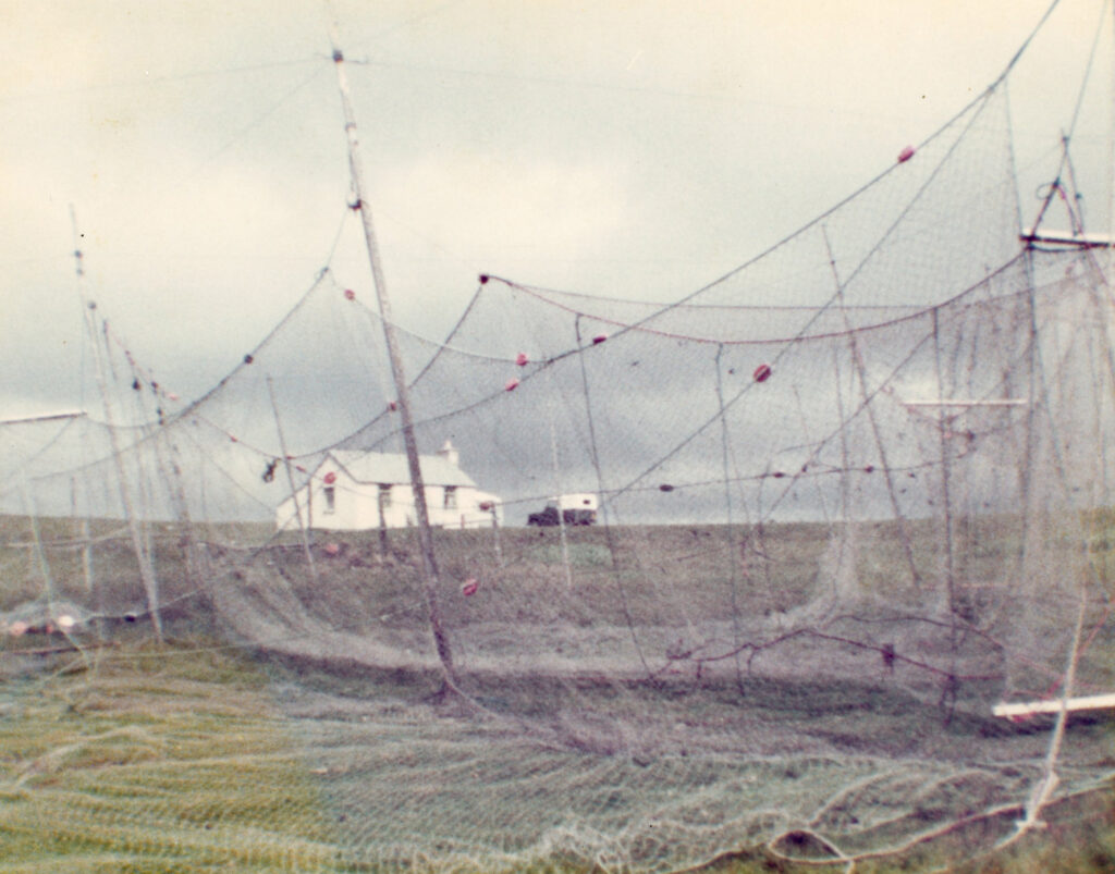 The net green at Fascadale with three bagnet “heads” hanging to be cleaned and mended. You can see the weed caught in the nets