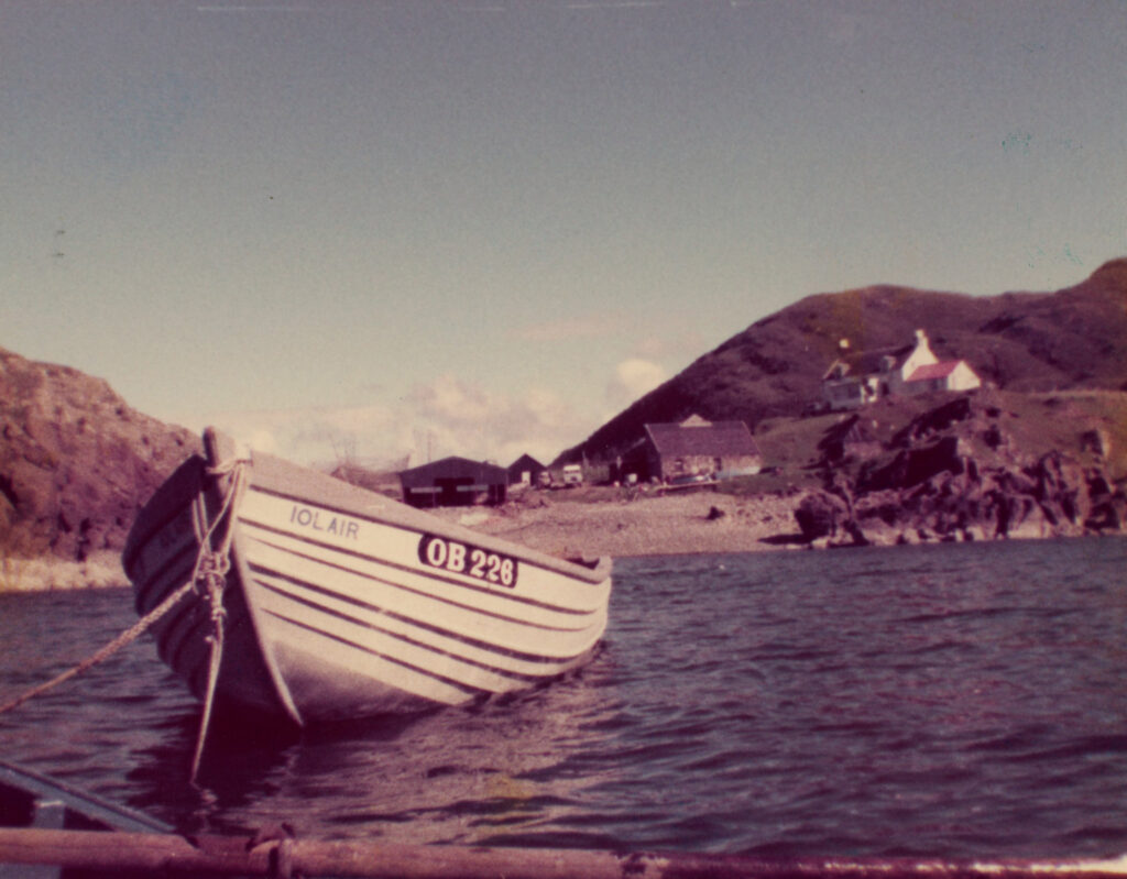 In 1975 the 26ft coble, OB209, the one now on display at Fascadale, was laid up in one of the boatsheds. This boat had no engine: her Petrol Paraffin Kelvin “Poppet” had been removed years before. That summer work started to re engine OB209 but this was abandoned as “much too difficult” and the decision was made, supported by the good catch that year, to buy a new boat.